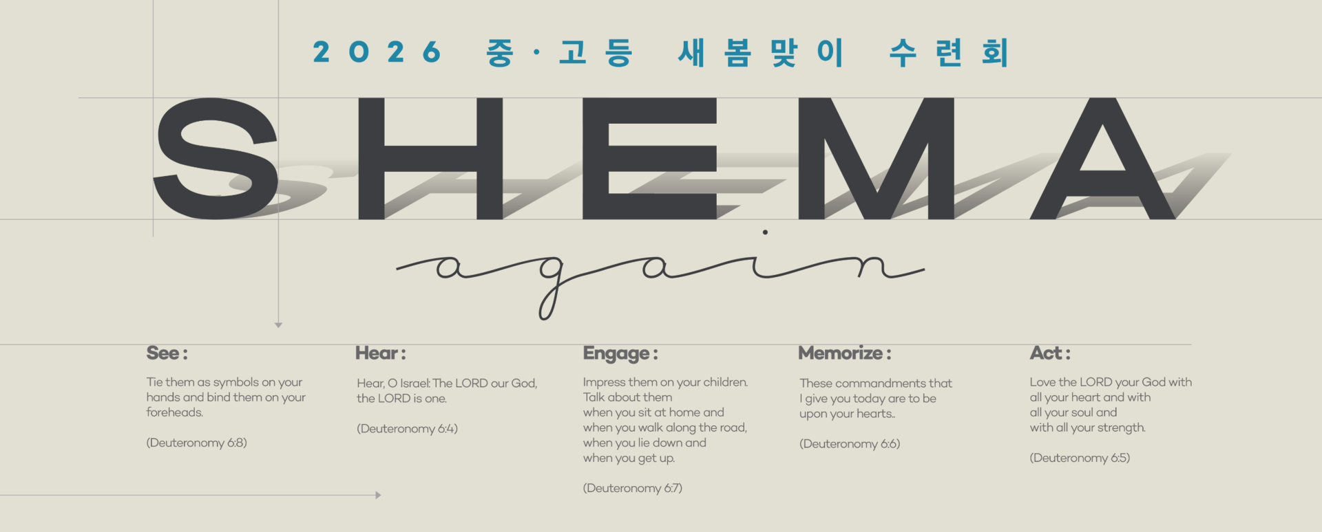 2026년 중,고등학교 새봄맞이 수련회는 “쉐마 어게인 (Shema Again) : Holding the Door”라는 주제로 신명기 6장 4–5절 말씀 “이스라엘아 들으라… 너는 마음을 다하고 뜻을 다하고 힘을 다하여 네 하나님 여호와를 사랑하라”를 중심으로, 아이들이 하나님을 사랑하는 믿음의 기초를 다시 세우는 시간이 되고 또 수요 기도회와 함께 진행되며 학생 뿐 아니라 온가족이 함께 드리는 예배로 진행됩니다.